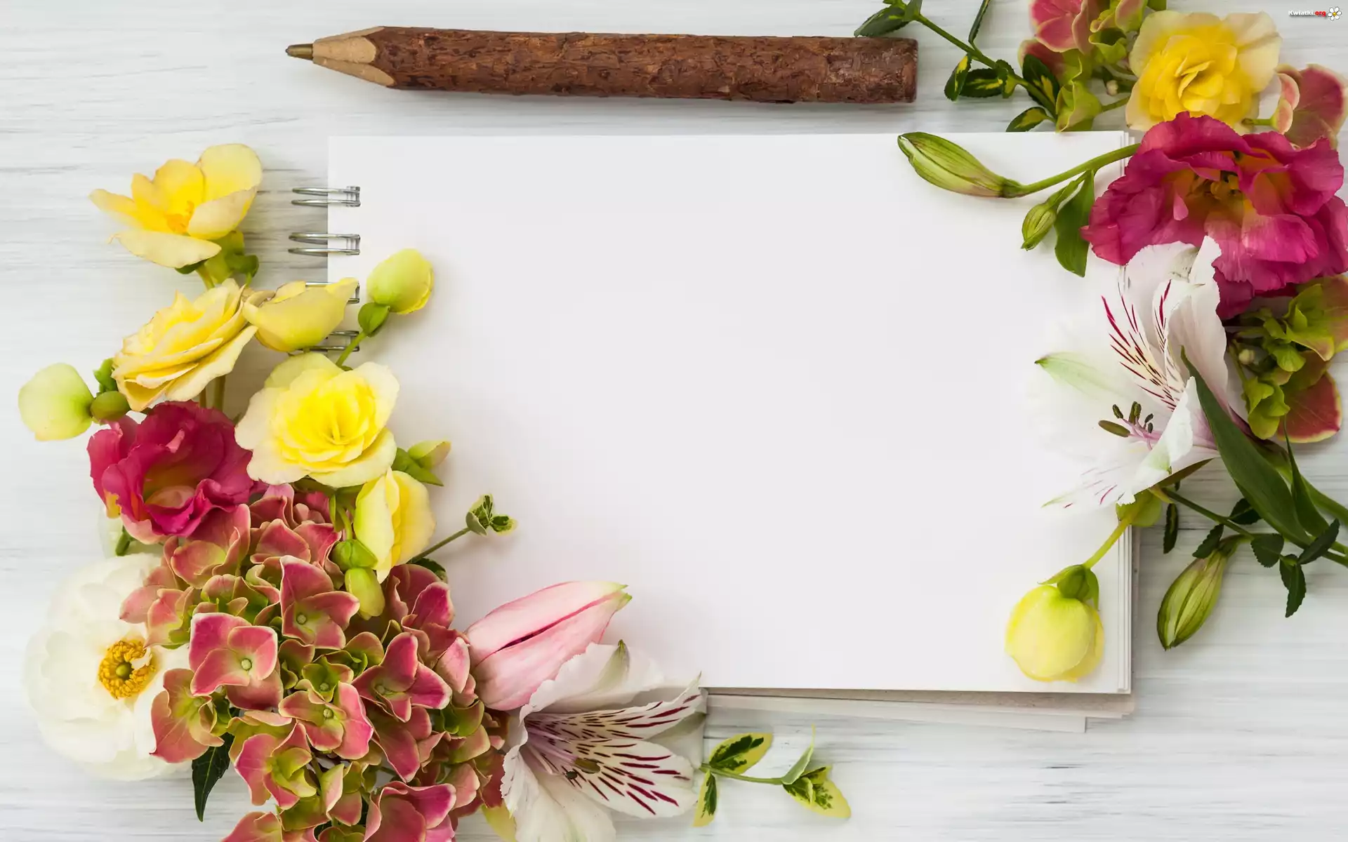Kwiat Kwiaty, Kompozycja, Notes, Ołówek, Hortensja, Tulipan, Lilia, Róże, Listki