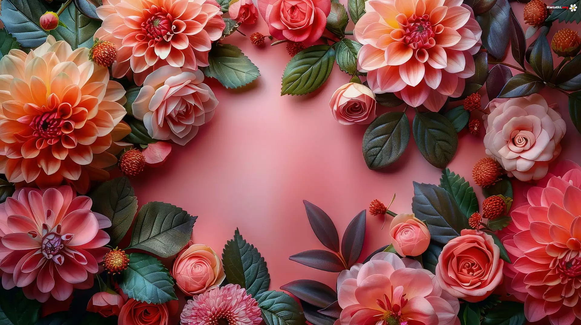 Kwiat Kwiaty, Dalie, Róże, Listki, Różowe, Tło