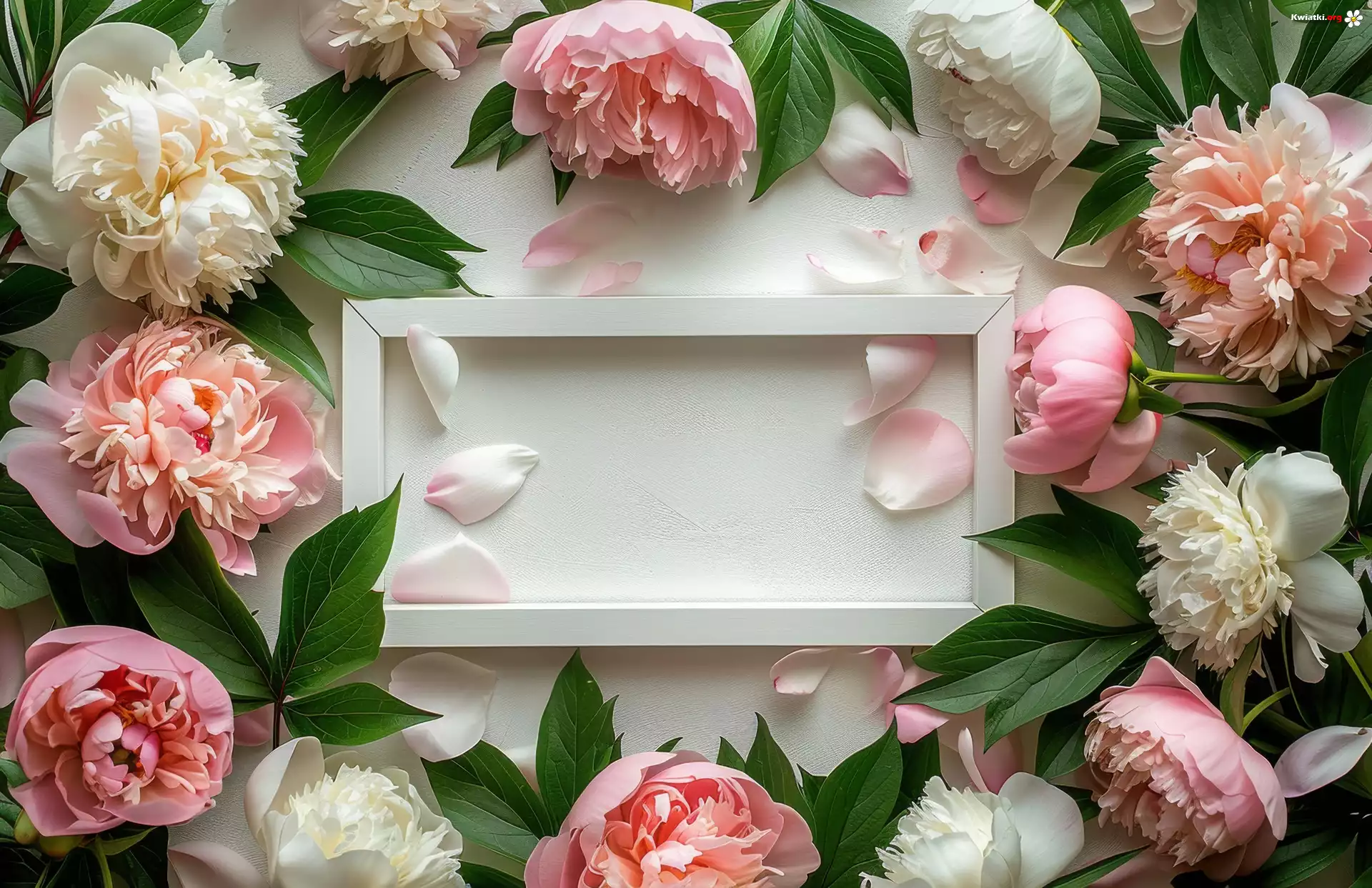 Białe, Różowe, Piwonie, Listy, Ramka, Płatki - Zdjęcia