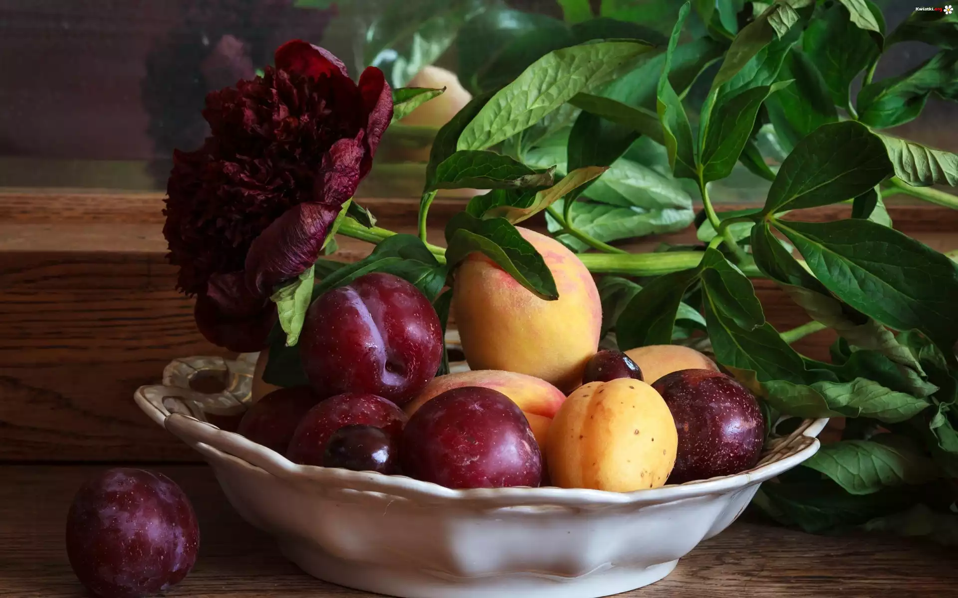 Śliwki, Morele, Piwonia, Kompozycja, Martwa Natura - Zdjęcia