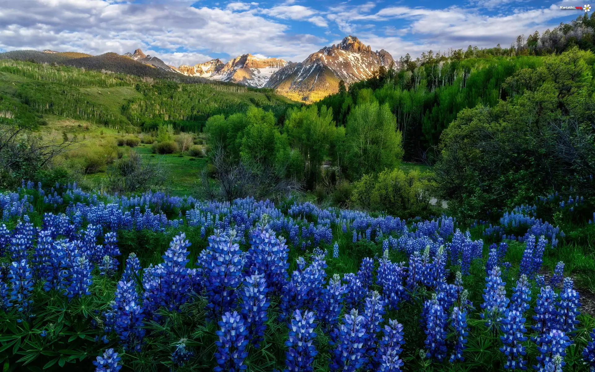 Góry, Polana, Kwiaty, Łubin, Drzewa, Zieleń, Chmury, Mount Sneffels, San Juan Mountain, Kolorado, Stany Zjednoczone - Zdjęcia |
