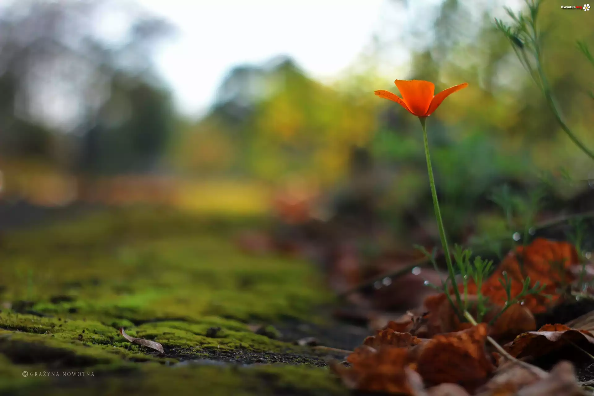 Pozłotka kalifornijska, Maczek kalifornijski, Kwiat, Mech, Suche, Liście - Zdjęcia