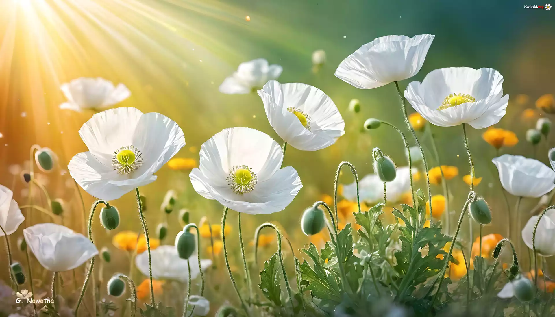 Promienie słońca, Białe, Maki, Kwiaty, Grafika - Zdjęcia