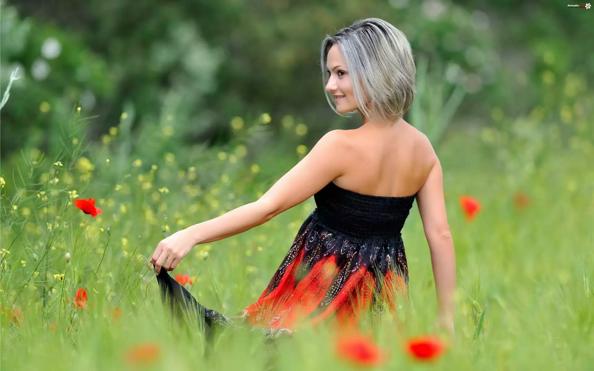 Kwiat Łąka, Kobieta, Maki, Trawa