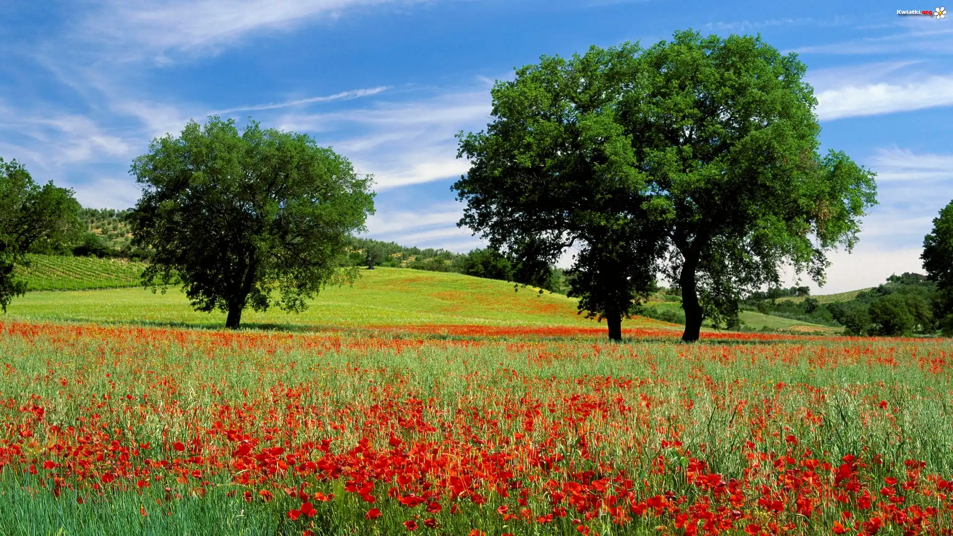 Łąka, Kwiaty, Maki, Drzewa - Zdjęcia