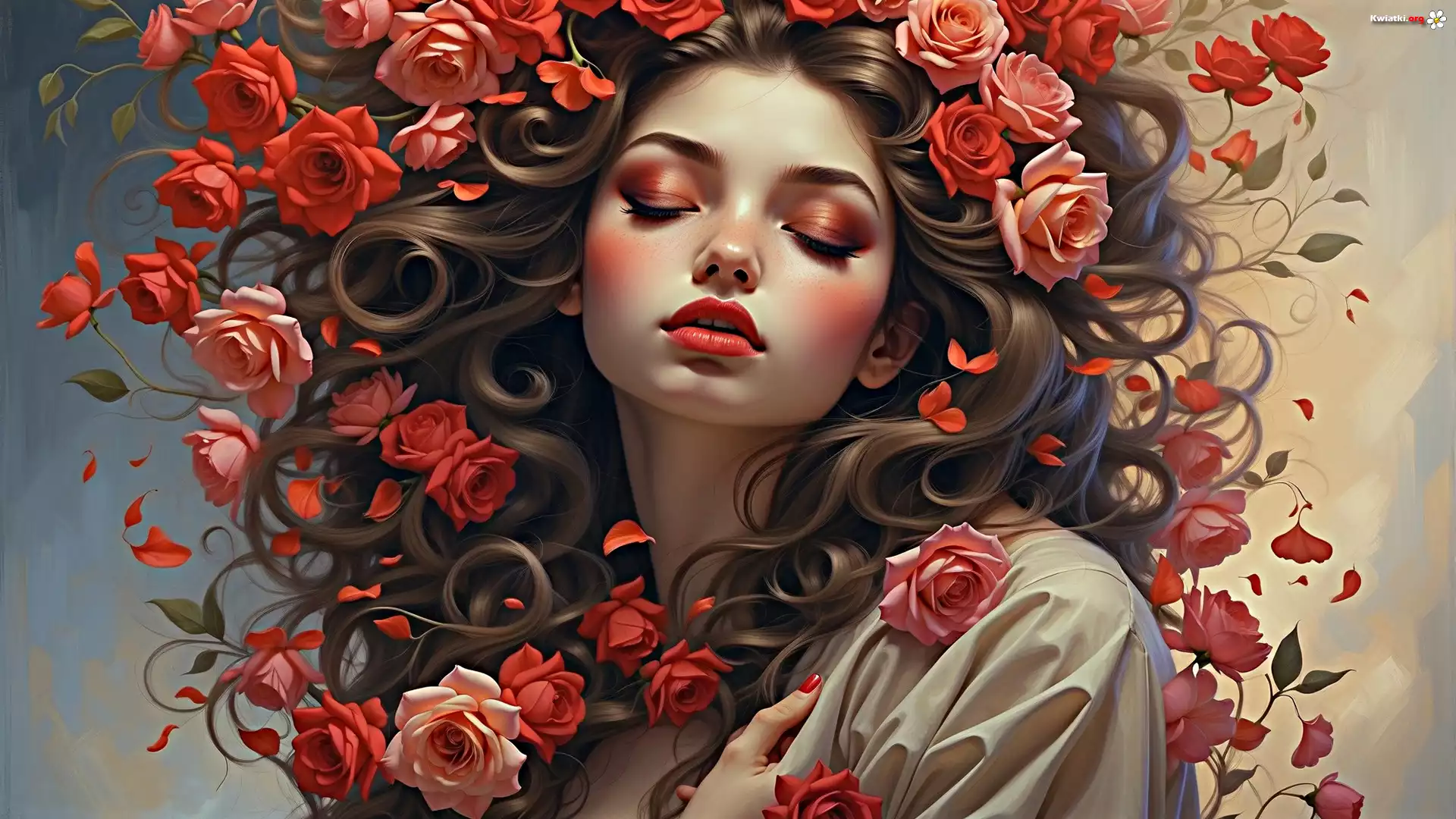 Kobieta, Makijaż, Kwiaty, Czerwone, Róże - Zdjęcia