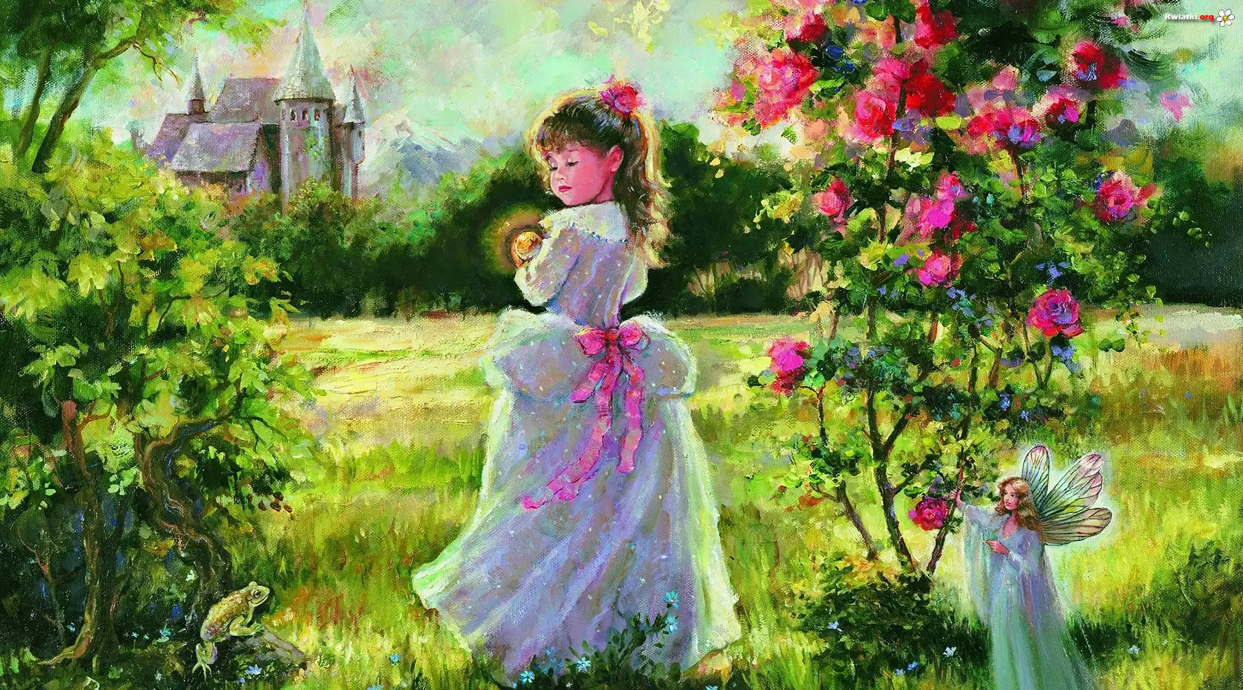 Malarstwo, Obraz, Dziewczynka, Aniołek, Kwiaty - Zdjęcia