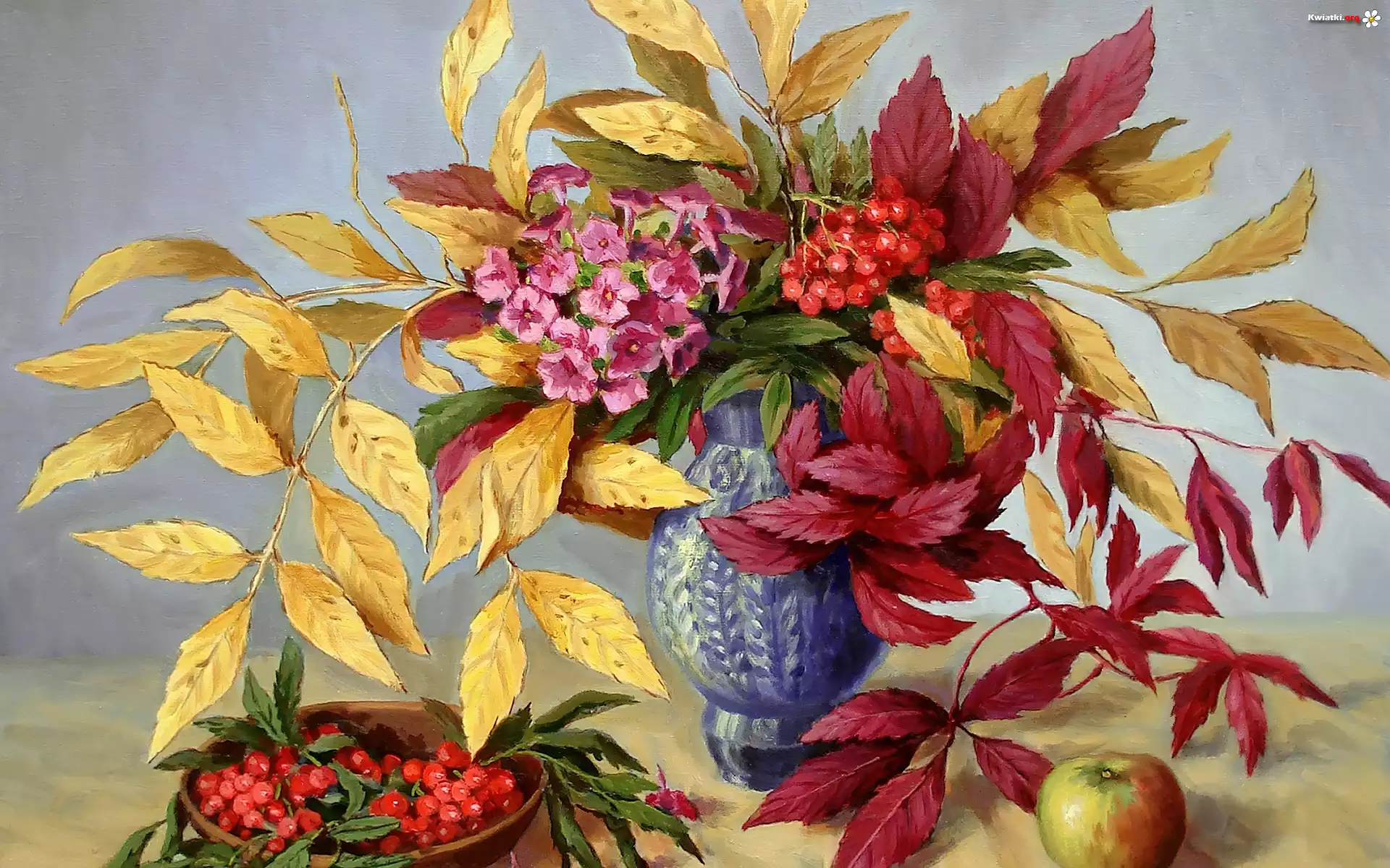 Malarstwo, Obraz, Kompozycja, Liście, Jarzębina, Kwiaty - Zdjęcia