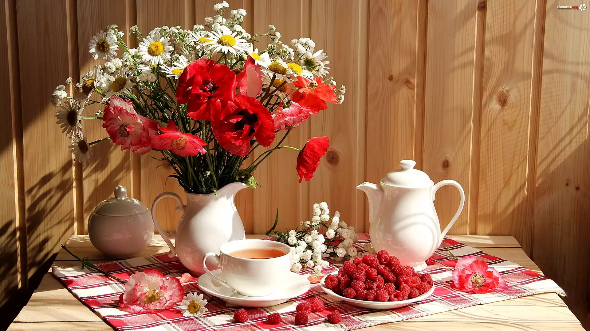 Kompozycja, Bukiet, Kwiaty, Maki, Margerytki, Filiżanka, Herbata, Dzbanek, Maliny - Zdjęcia