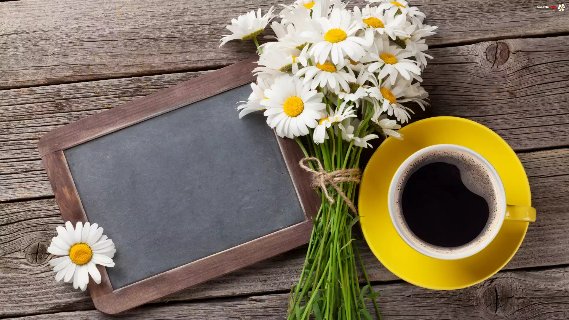 Filiżanka, Kawa, Kwiaty, Margerytki, Tabliczka, Kompozycja - Zdjęcia
