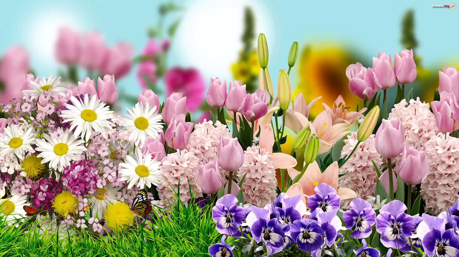 Kwiaty, Margerytki, Hiacynty, Bratki, Lilia, Tulipany, 2D - Zdjęcia
