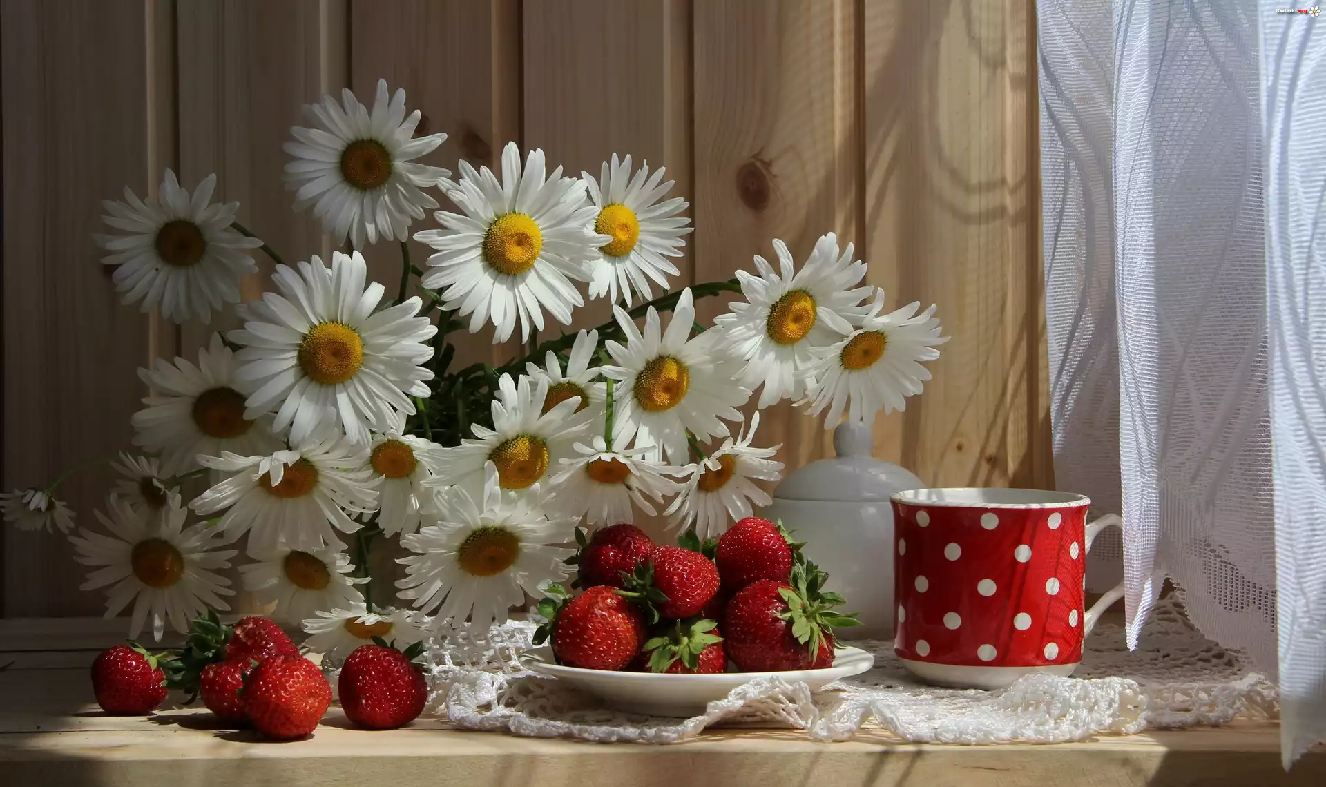 Kompozycja, Margerytki, Bukiet, Kwiaty, Truskawki, Okno, Firanka, Światło - Zdjęcia