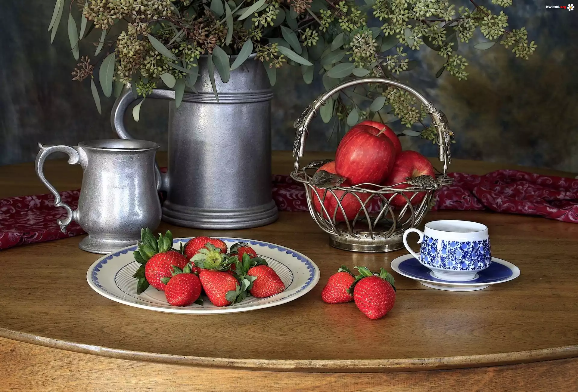 Kwiat Martwa Natura, Truskawki, Jabłka, Naczynia