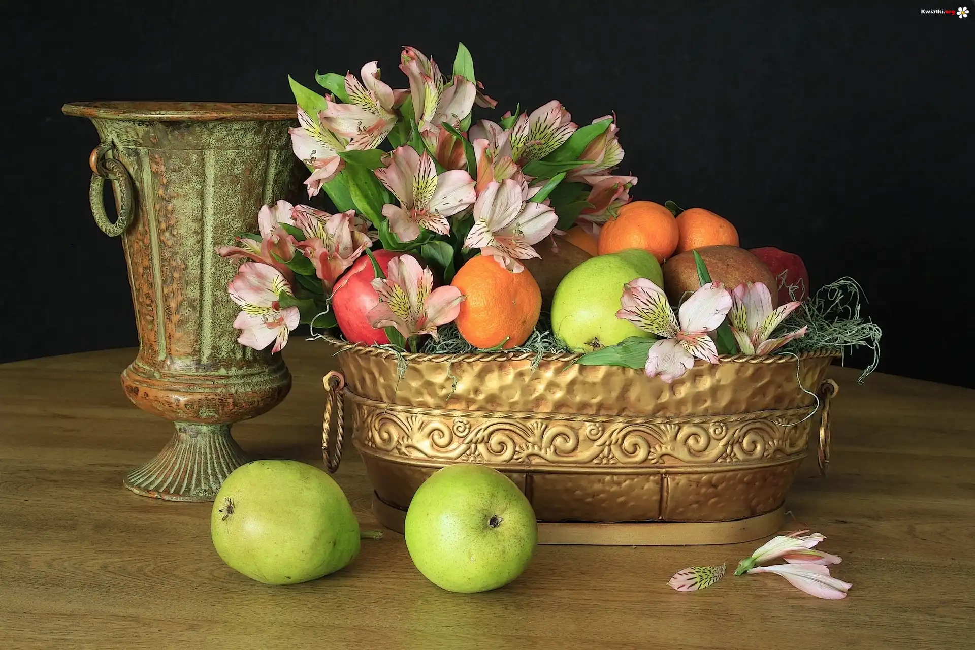 Kwiat Martwa natura, Mosiężne, Wazy, Kwiaty, Alstremeria, Owoce
