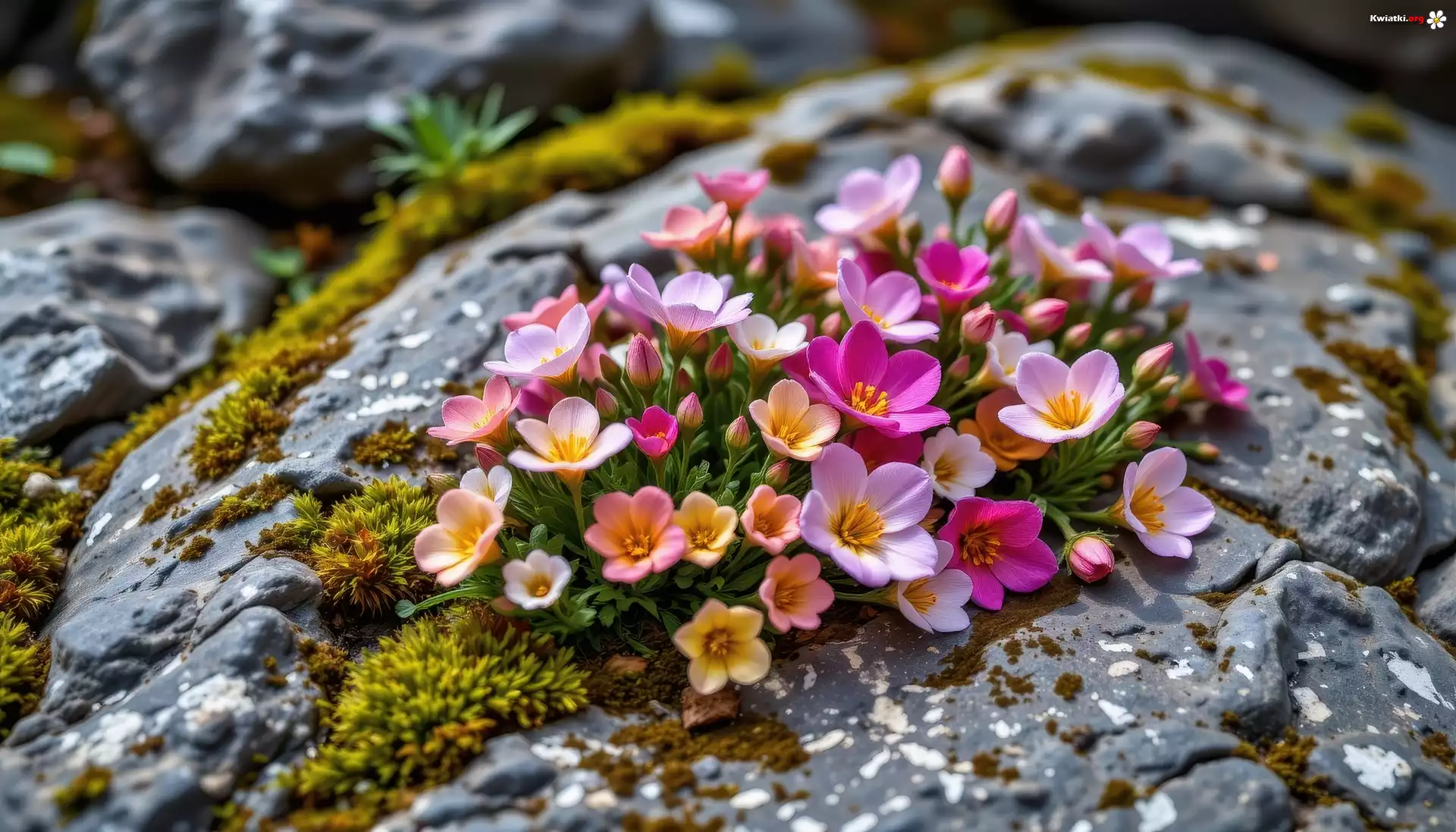 Kolorowe, Kwiaty, Skała, Mech - Zdjęcia