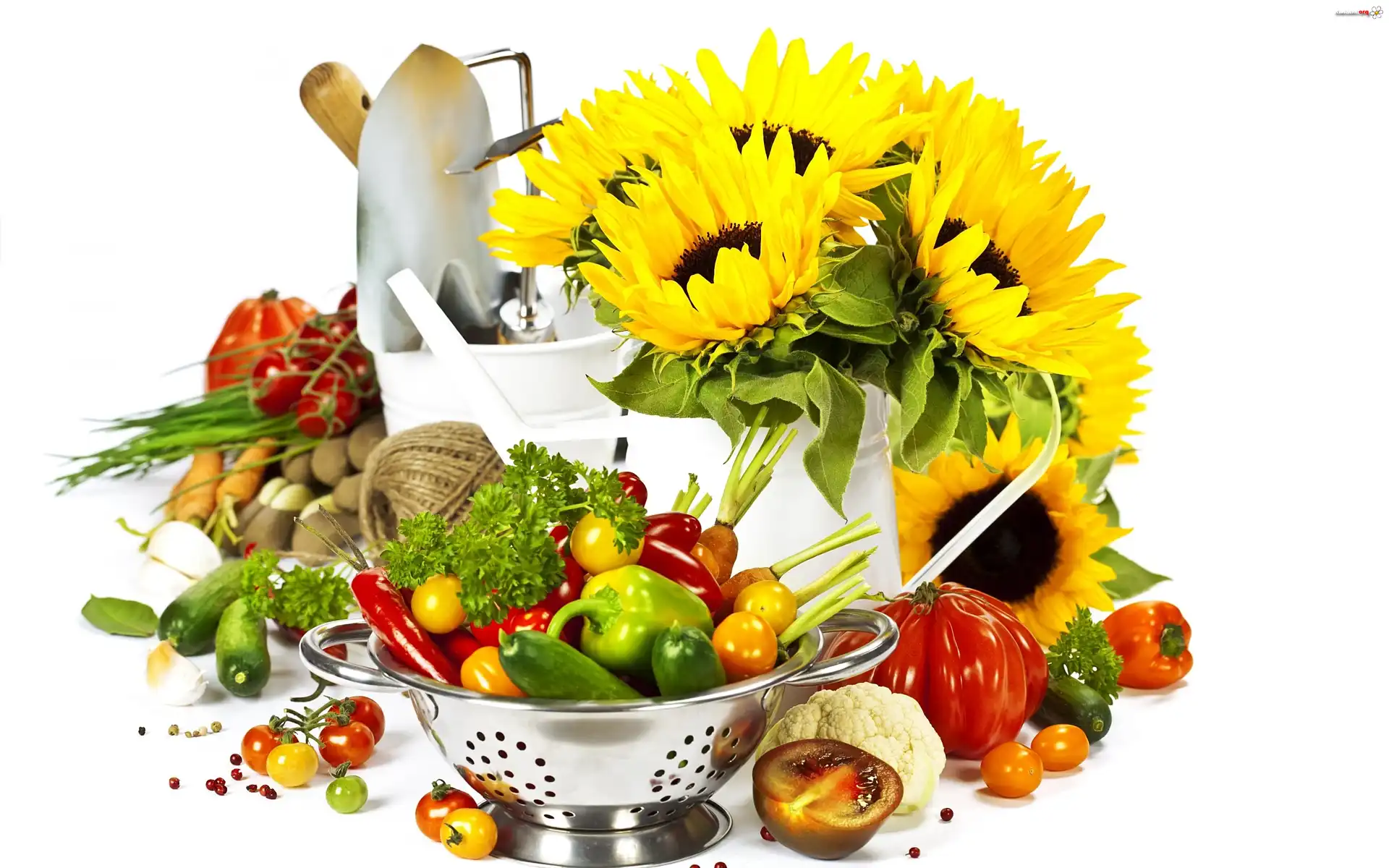 Kwiat Słoneczniki, Miska Warzyw, Ogórki, Pomidory, Papryka, Kompozycja