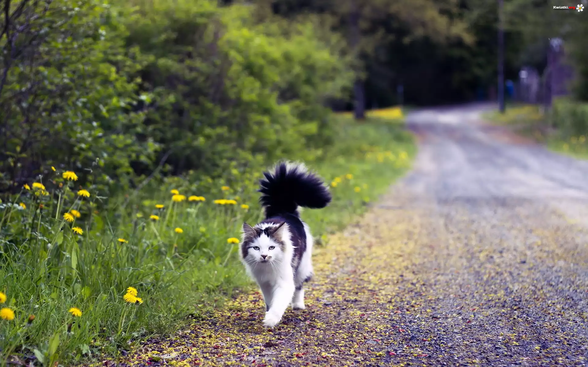 Biało, Czarny, Kot, Puszysty, Ogon, Las, Droga, Żółte, Mlecze - Zdjęcia