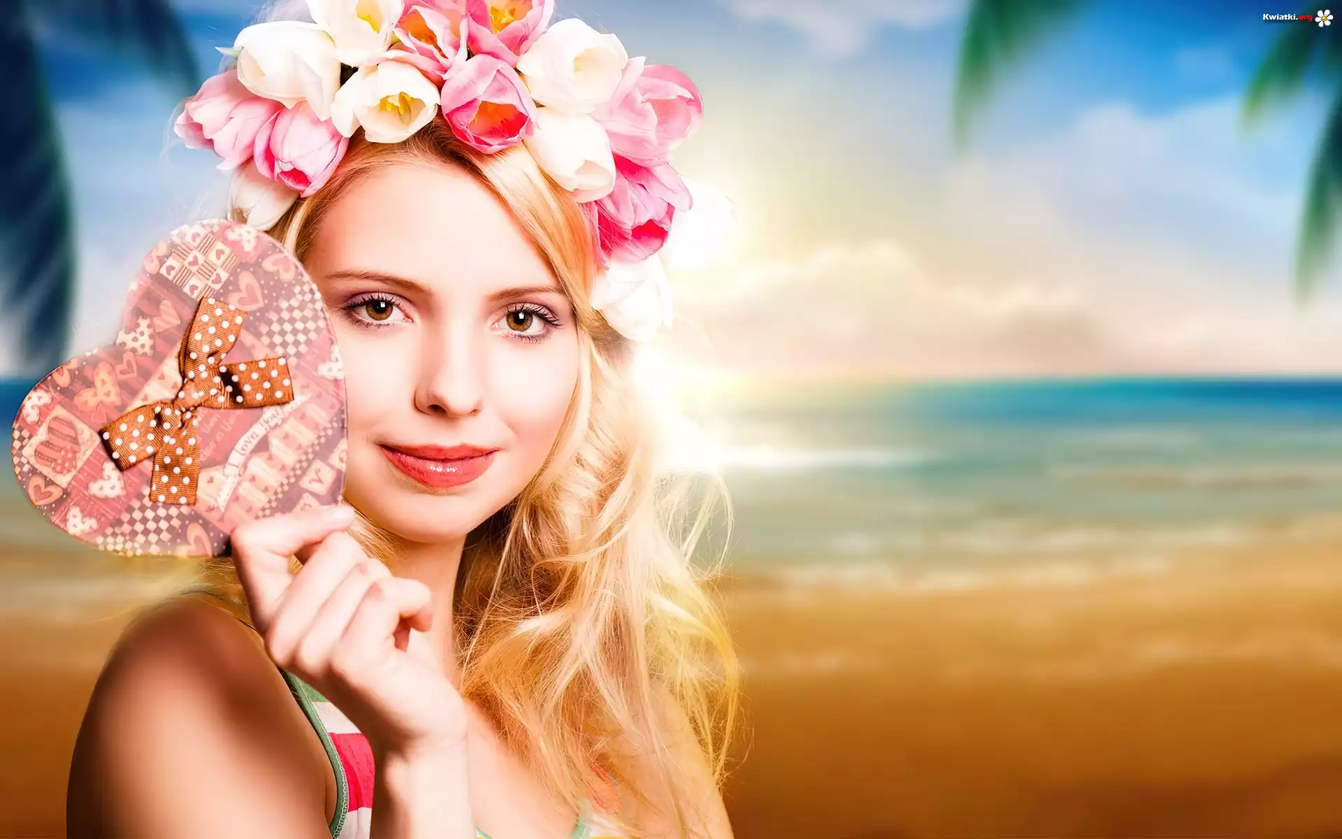 Morze, Brzeg, Kobieta, Wianek, Kwiaty, Serce - Zdjęcia