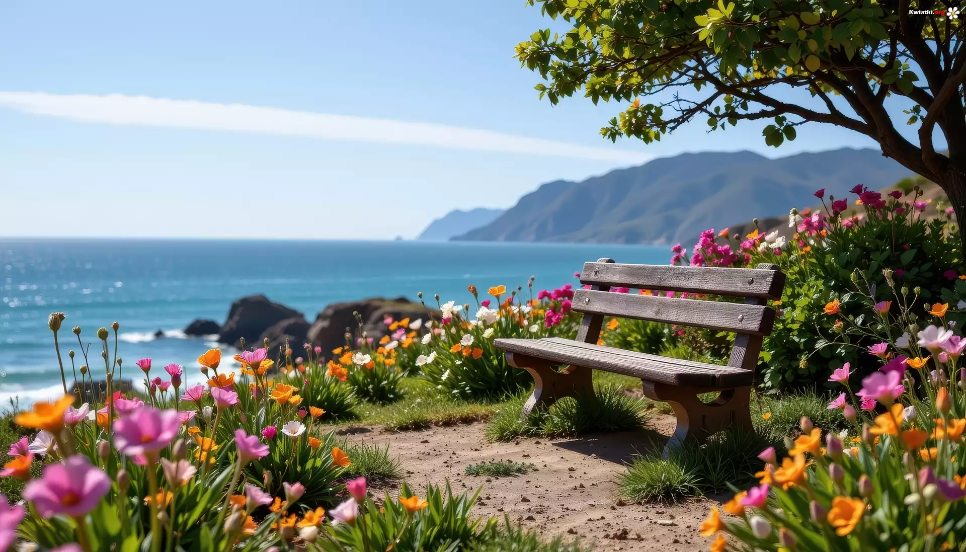 Ławka, Kwiaty, Drzewo, Morze - Zdjęcia