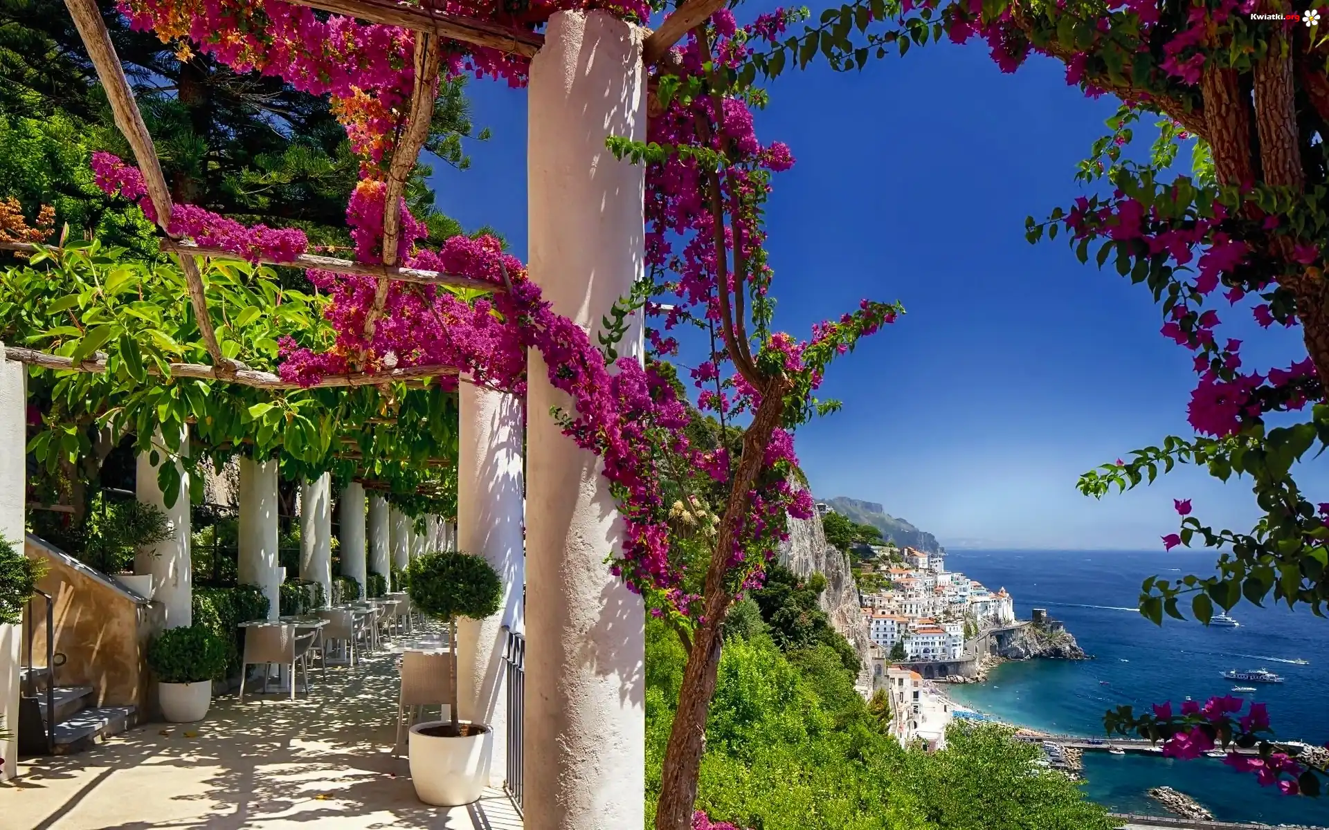 Kwiat Morze, Skały, Kwiaty, Bugenwilla, Patio, Włochy