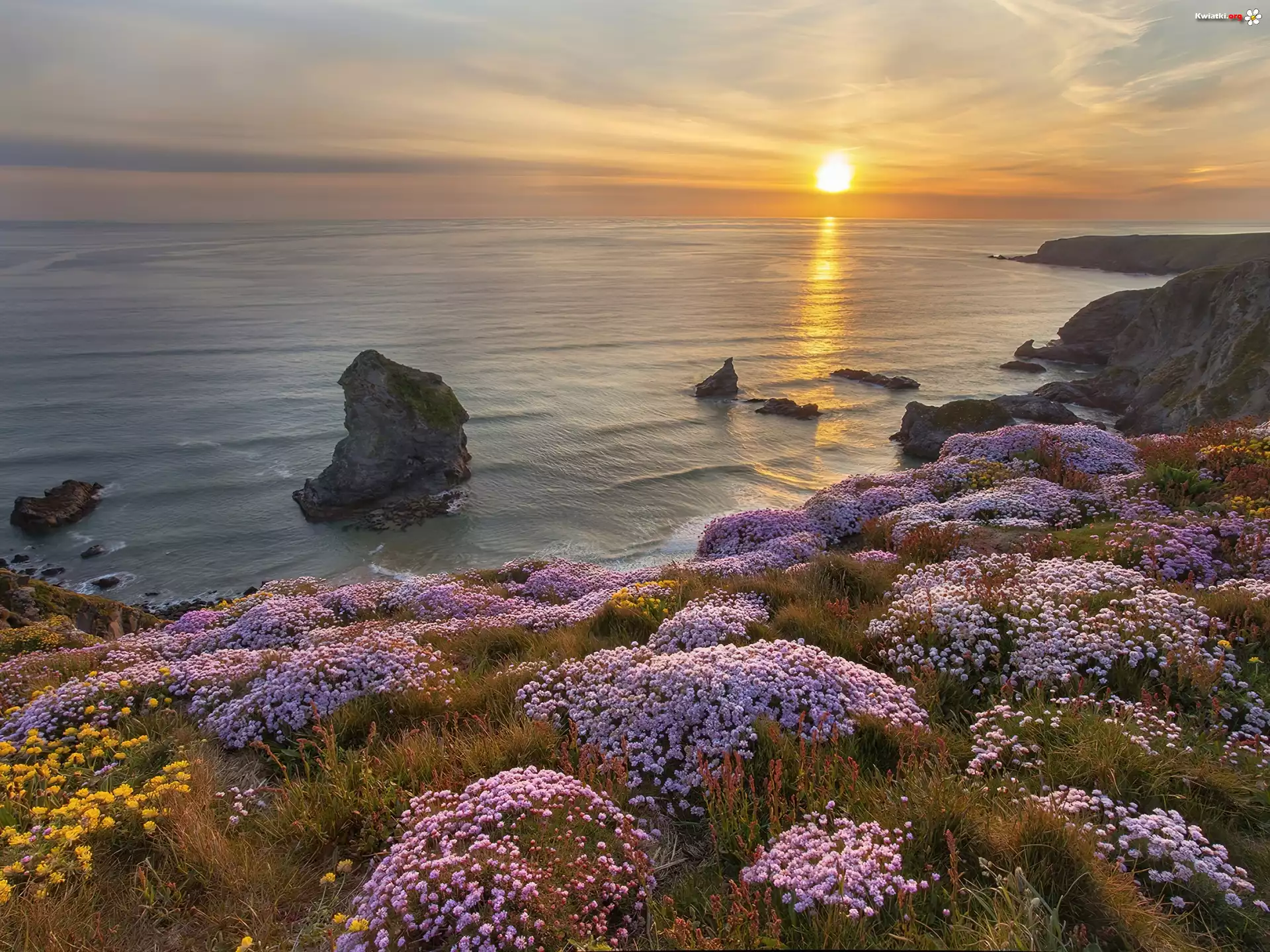 Kwiat Morze, Zachód, Słońca, Skały, Kwiaty