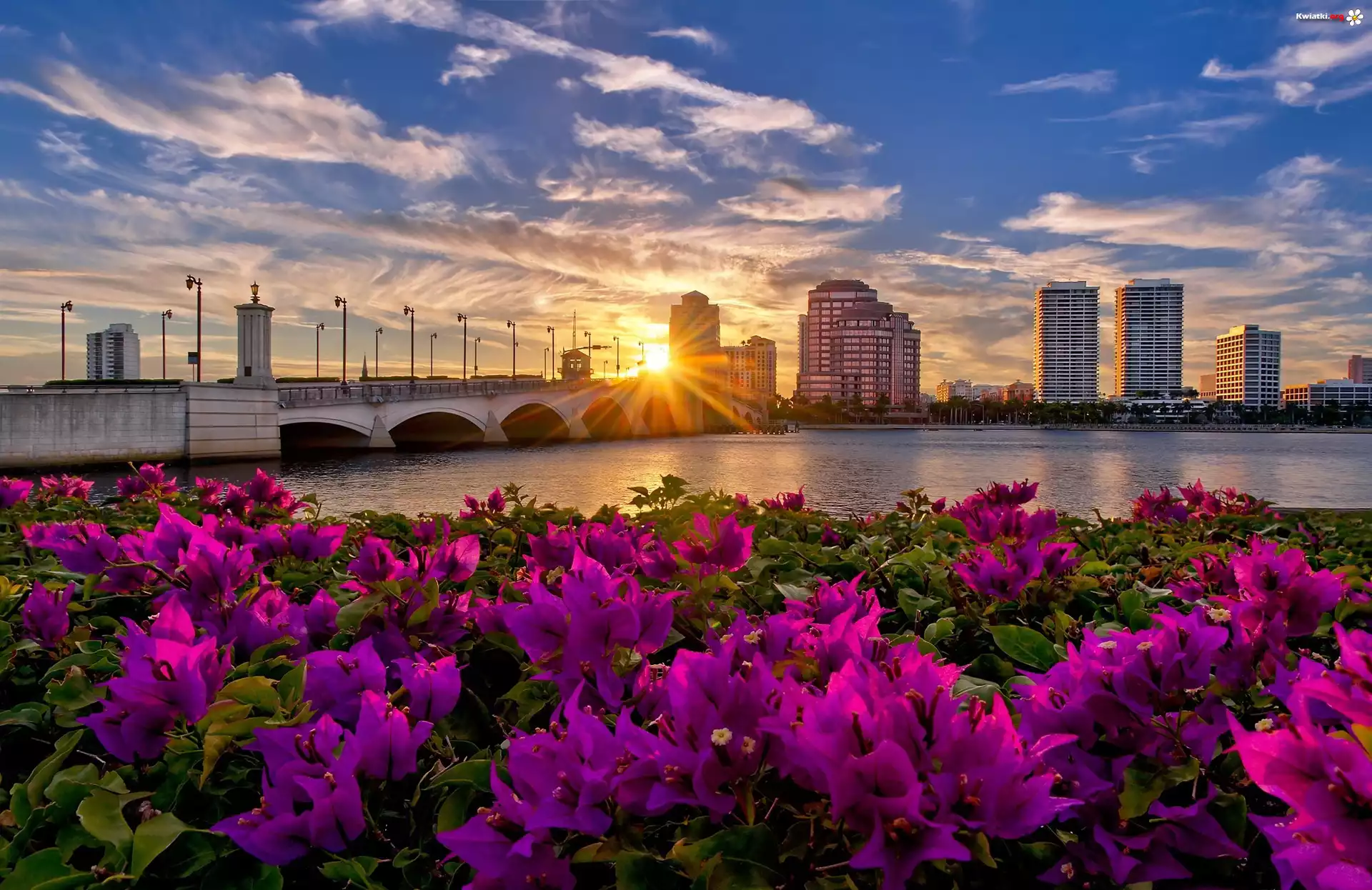 Kwiat Rzeka, Most, Kwiaty, Wieżowce, Promienie, Słońca, Panorama, Miasta