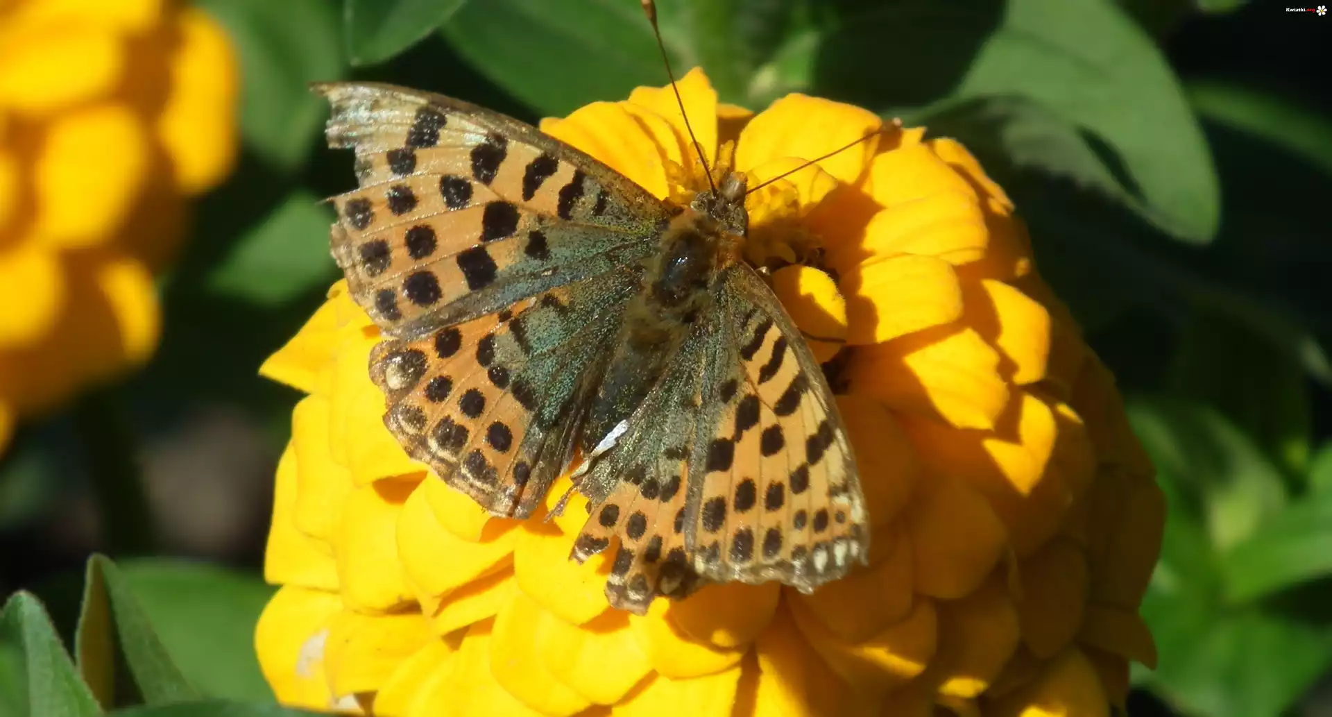 Motyl, Perłowiec malinowiec, Kwiat, Cynia, Żółta - Zdjęcia