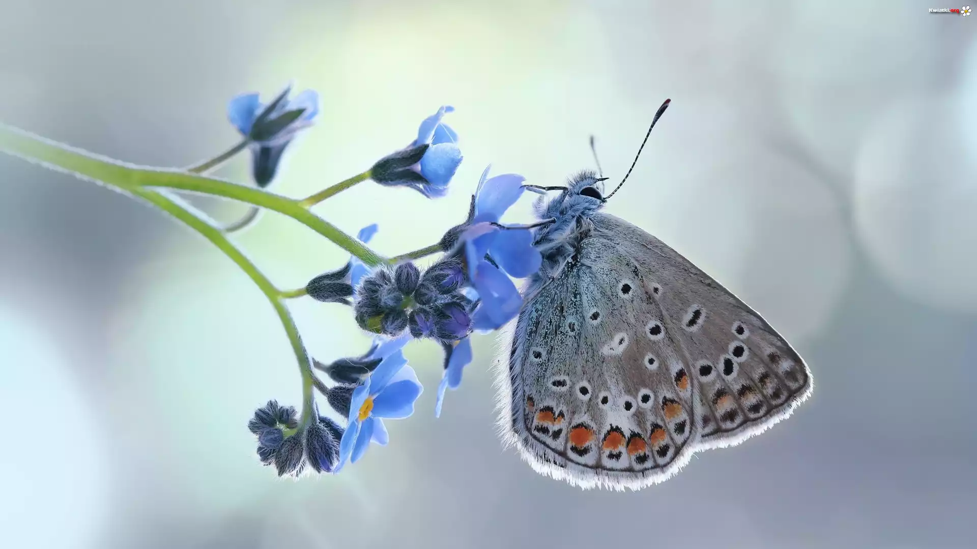Motyl, Modraszek ikar, Kwiat, Niezapominajka, Makro - Zdjęcia