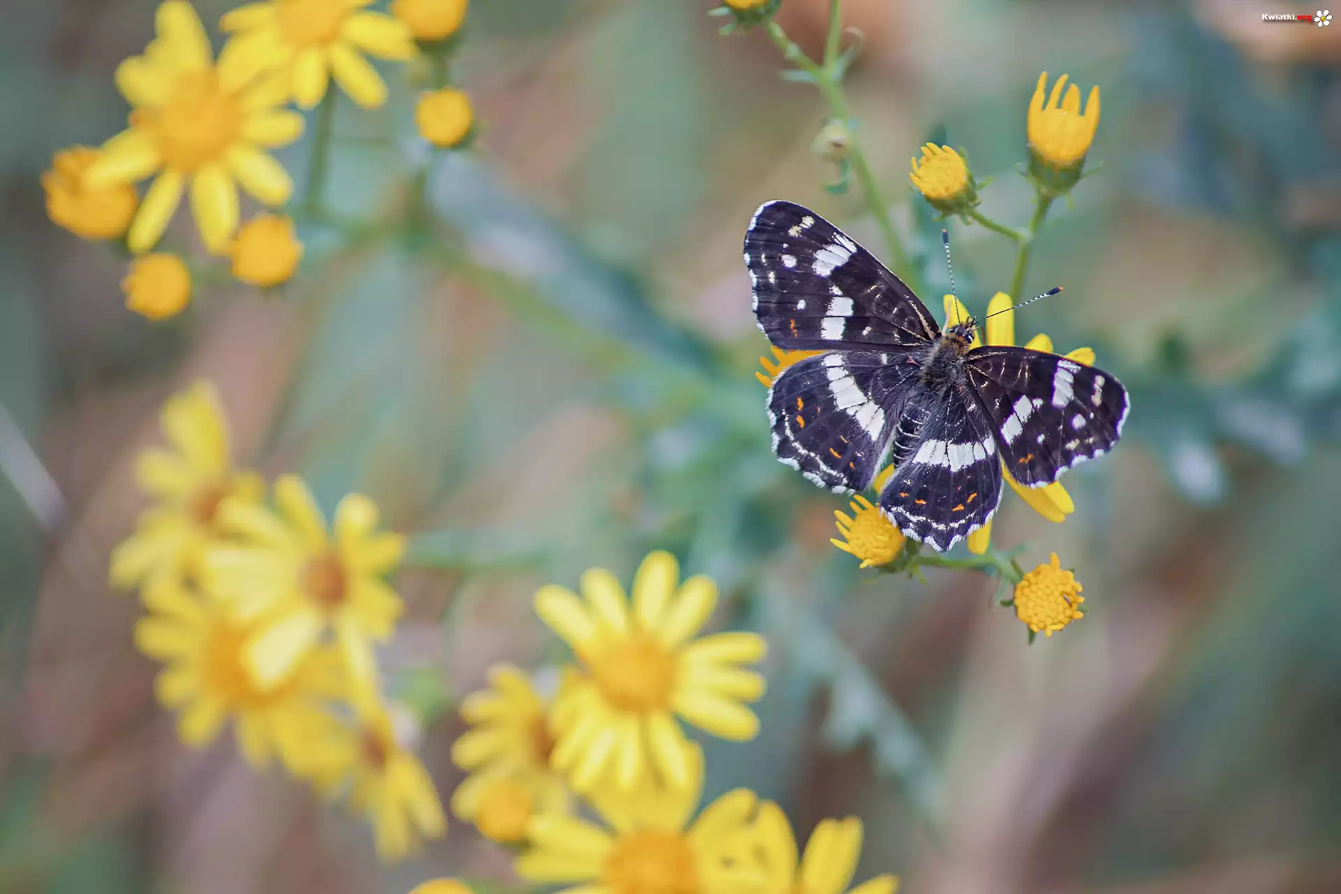 Motyl, Żółte, Kwiaty, Rozmyte, Tło - Zdjęcia