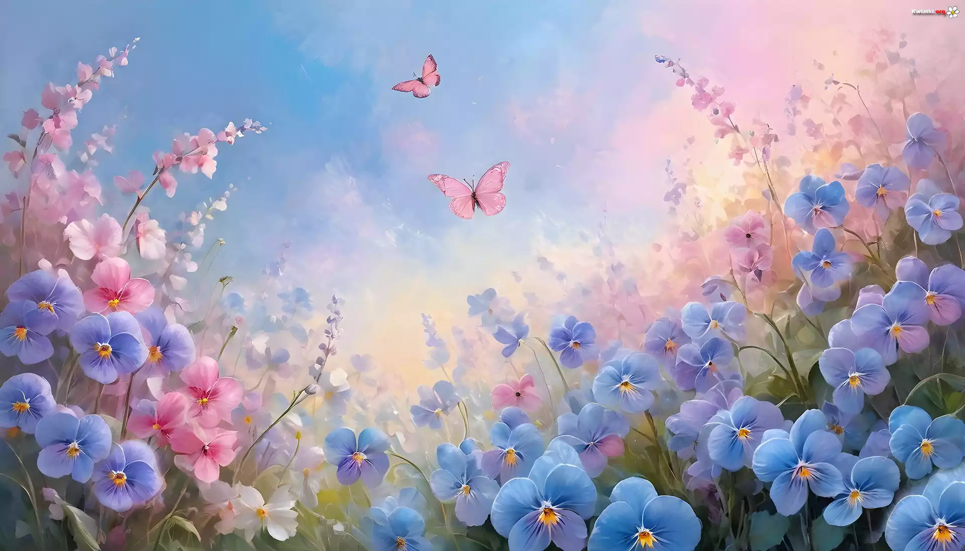 Niebieskie, Różowe, Kwiaty, Motyle, Grafika AI - Zdjęcia