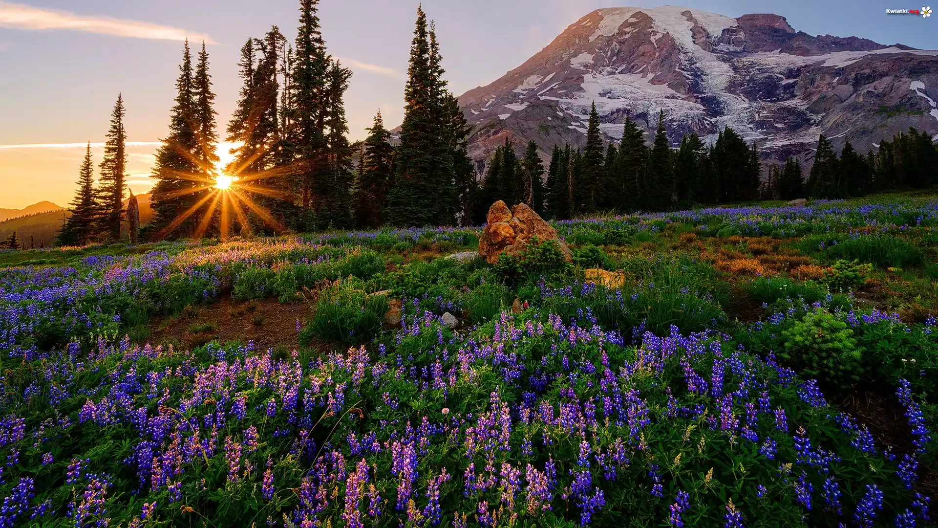 Góra, Drzewa, Świerki, Łąka, Kwiaty, Łubin, Park Narodowy Mount Rainier, Stan Waszyngton, Stany Zjednoczone - Zdjęcia |
