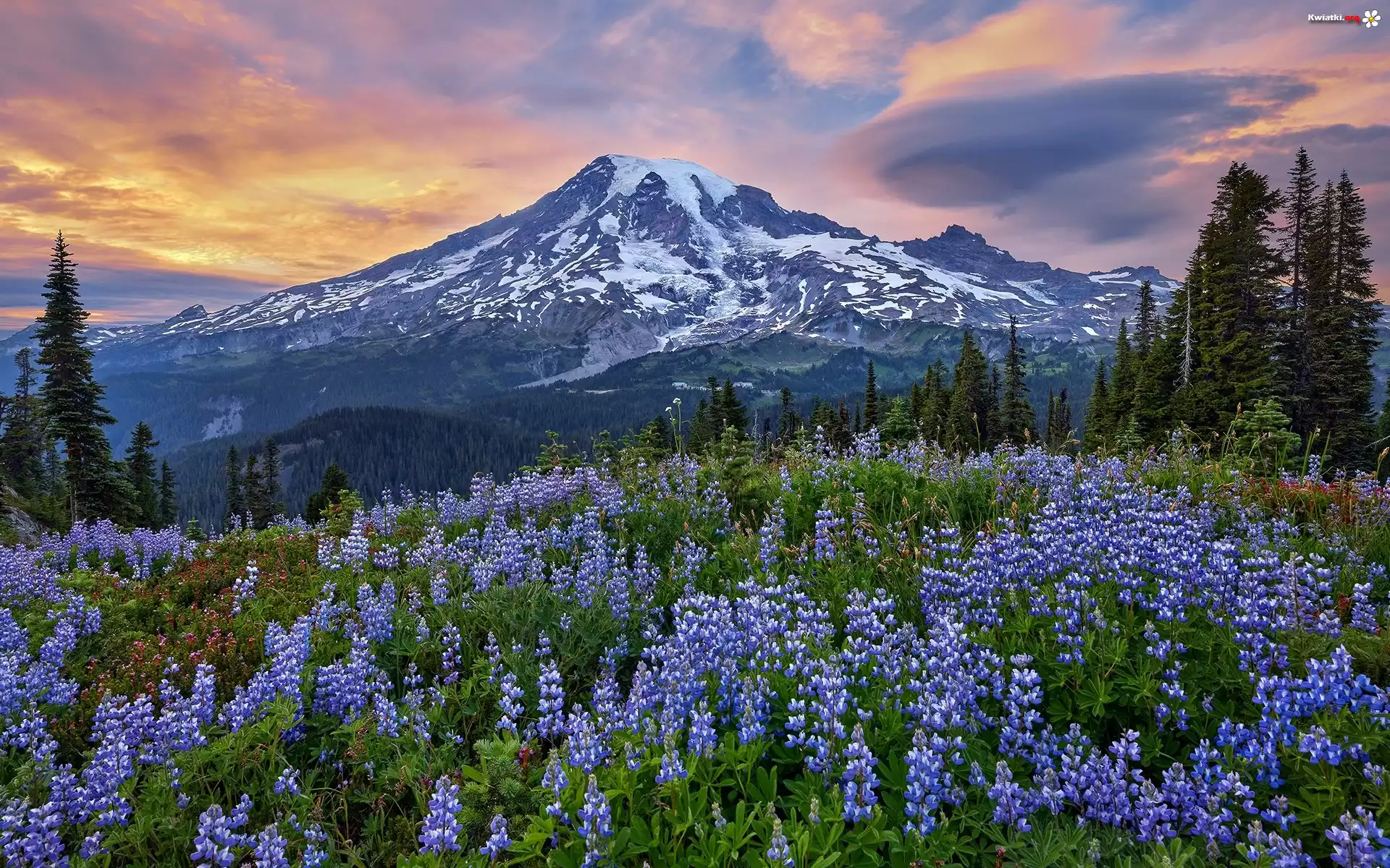 Góry, Łąka, Niebieskie, Łubiny, Drzewa, Stratowulkan, Mount Rainier, Park Narodowy Mount Rainier, Stan Waszyngton, Stany Zjednoczone - Zdjęcia |