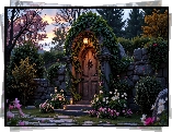 Kwiat Mur, Schody, Drzwi, Latarnia, Różowe, Białe, Kwiaty, Rośliny, Drzewa