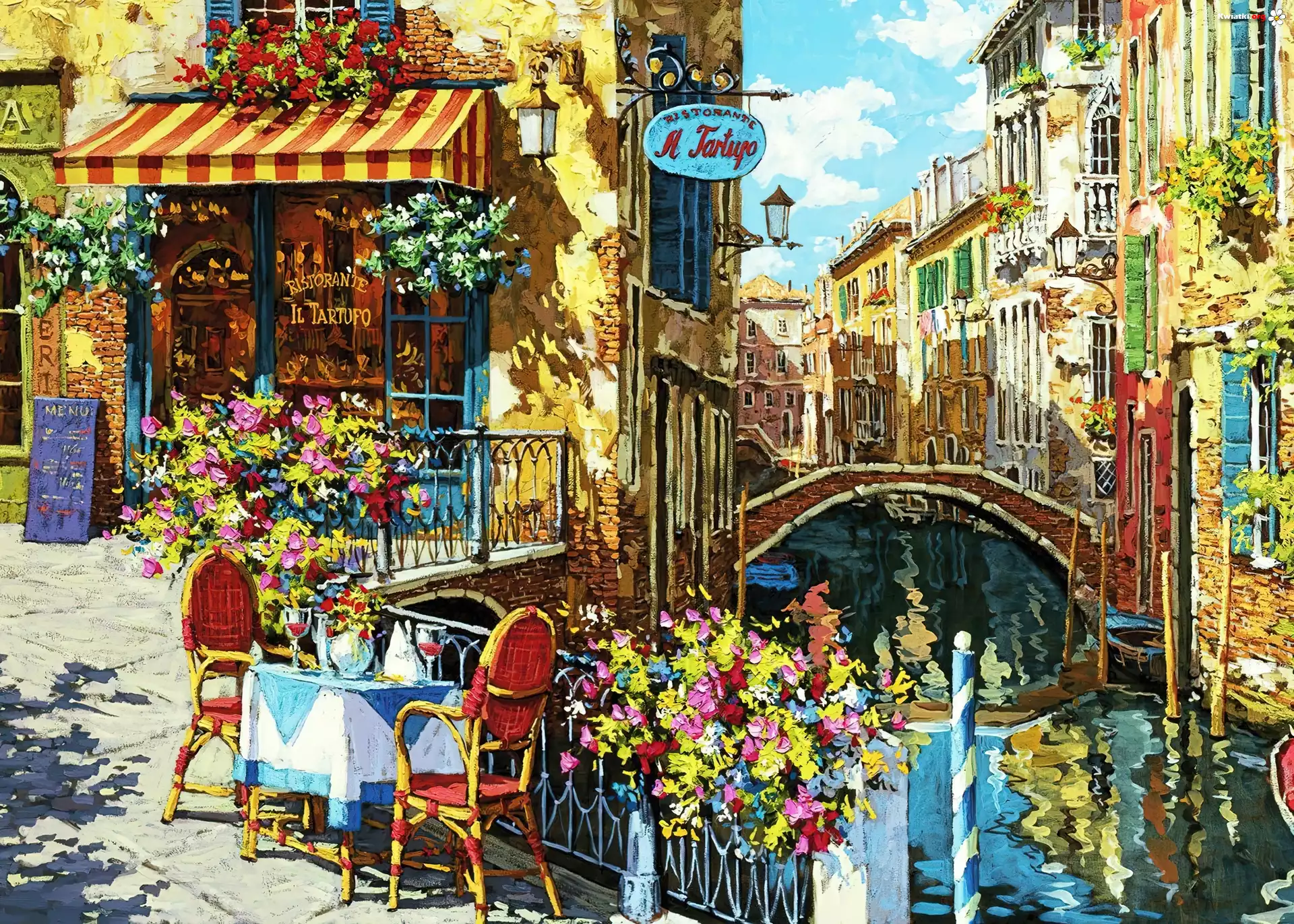 Kawiarenka, Na, Ulicy, Domy, Sklepy, Kanał, Most, Kwiaty - Zdjęcia