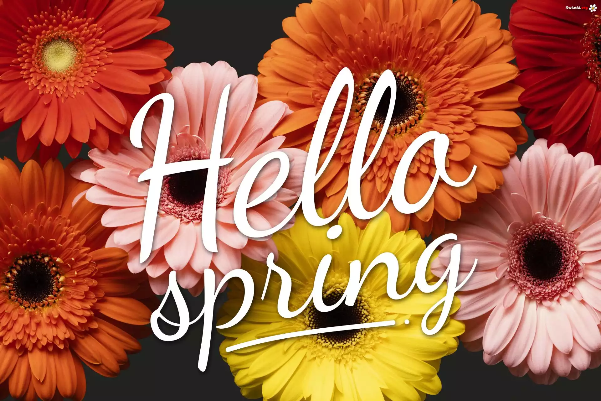 Kwiaty, Kolorowe, Gerbery, Napis, Hallo spring - Zdjęcia