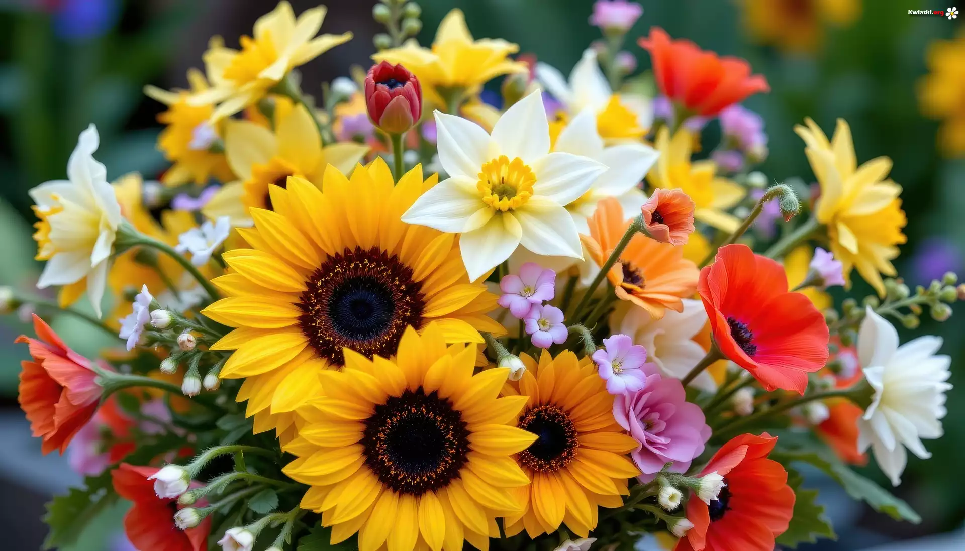 Kwiaty, Słoneczniki, Maki, Narcyzy, Kolorowy, Bukiet - Zdjęcia
