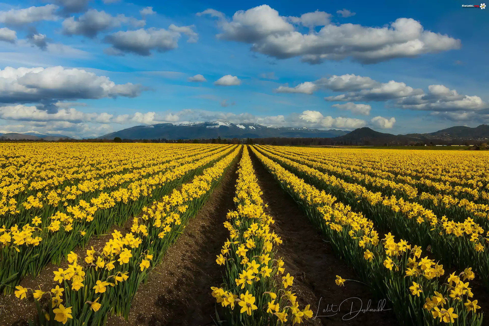 Pole, Kwiaty, Żółte, Narcyzy żonkile, Plantacja, Góry - Zdjęcia