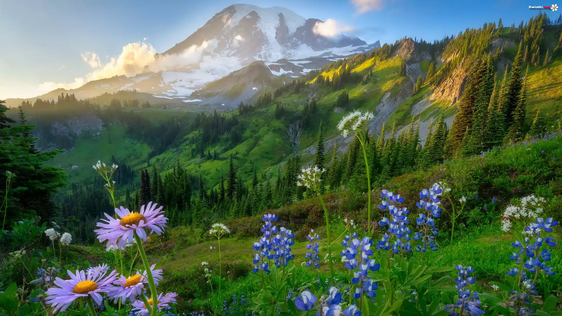 Łąka, Stratowulkan Mount Rainier, Park Narodowy Mount Rainier, Góry, Fioletowe, Kwiaty, Łubin, Wschód słońca, Stan Waszyngton, Stany Zjednoczone - Zdjęcia |