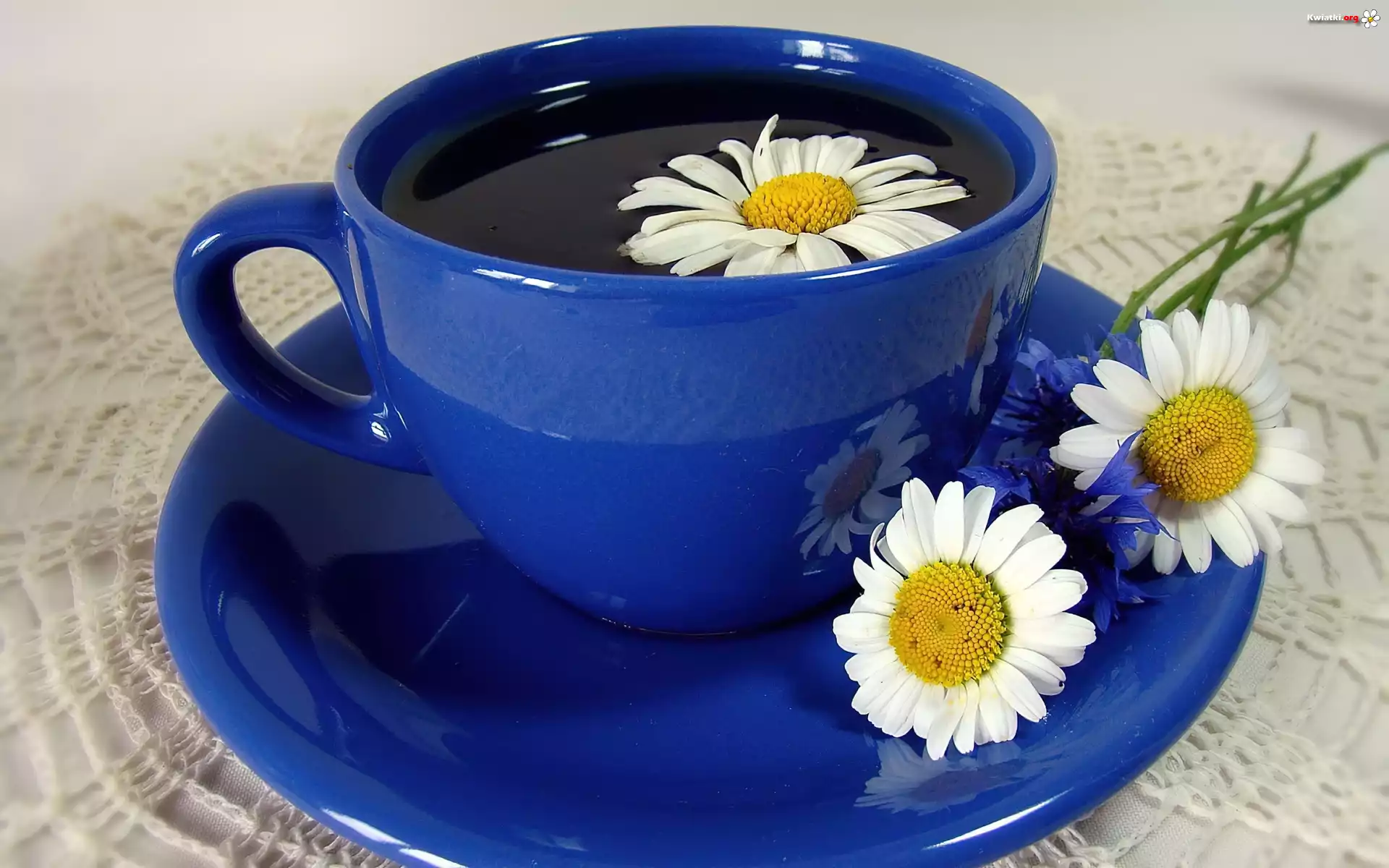 Niebieska, Filiżanka, Talerzyk, Herbata, Rumianek - Zdjęcia