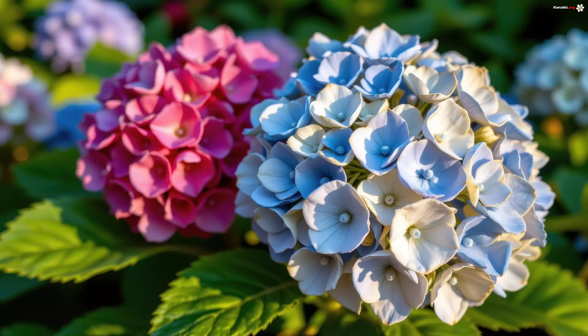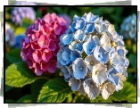 Biało-niebieska, Różowa, Hortensja, Listki - Zdjęcia