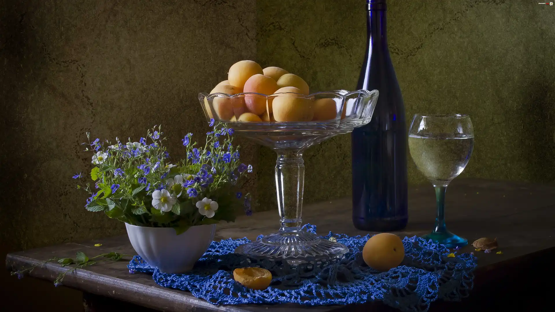 Kompozycja, Patera, Morele, Butelka, Kieliszek, Kwiaty, Truskawek, Przetacznik, Niebieska, Serweta - Zdjęcia |