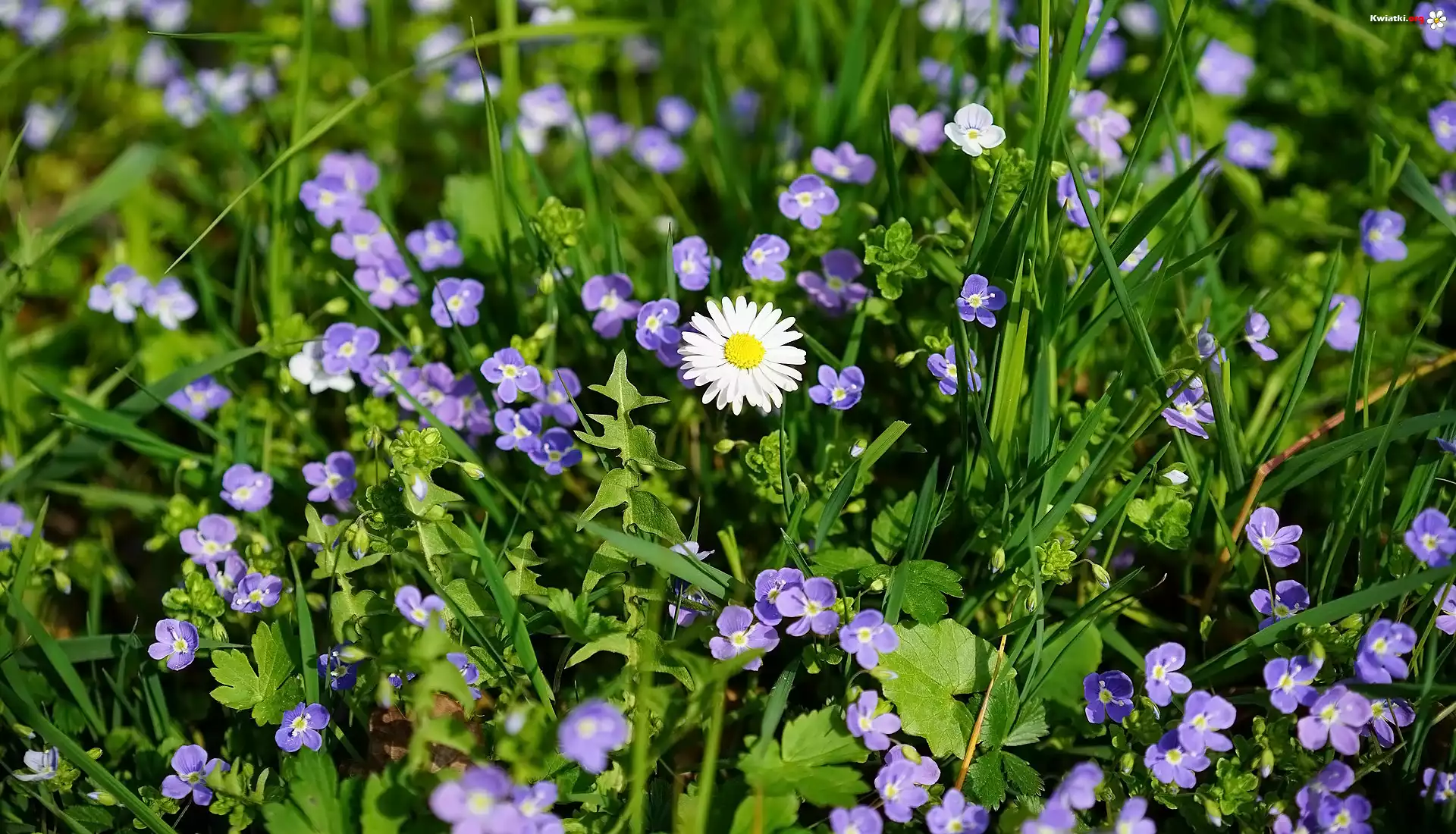 Kwiaty, Niebieskie, Przetacznik, Stokrotka - Zdjęcia