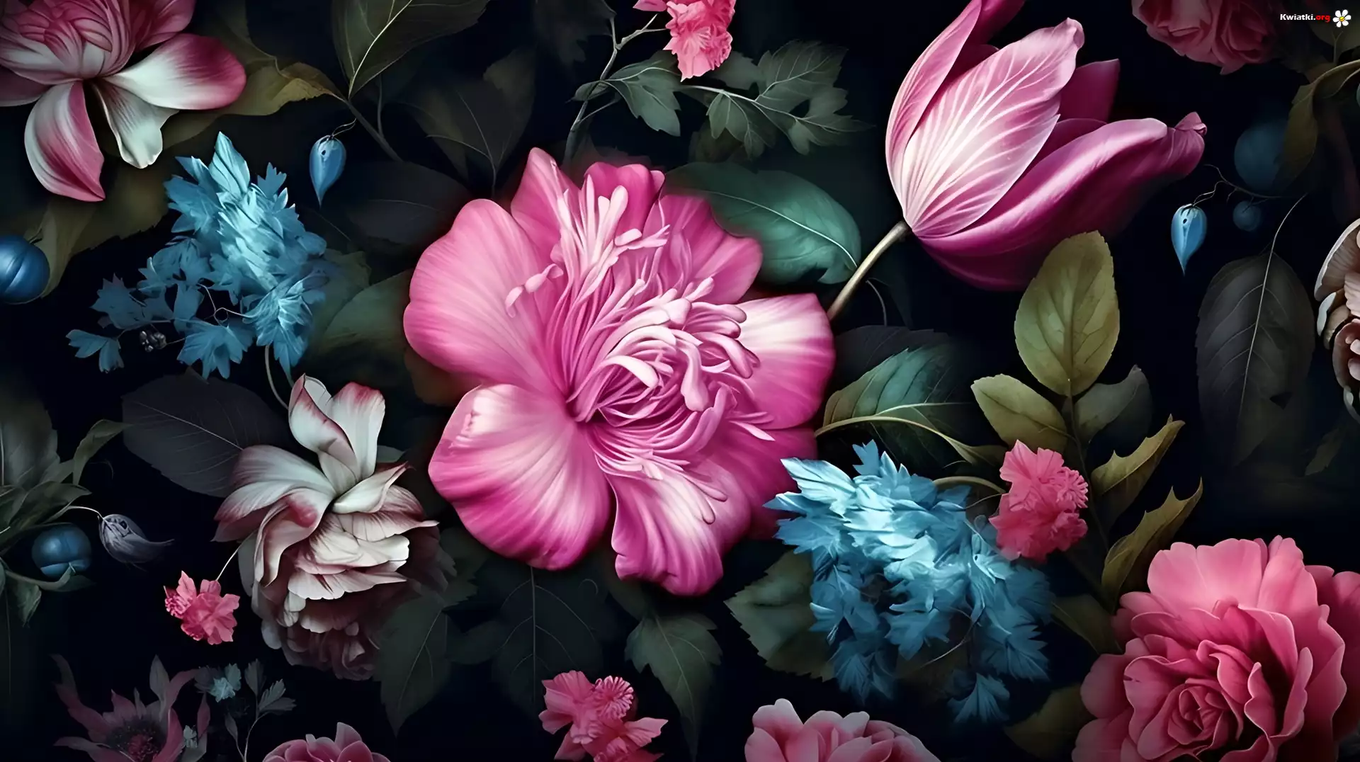 Różowe, Niebieskie, Kwiaty, Listki, Grafika - Zdjęcia