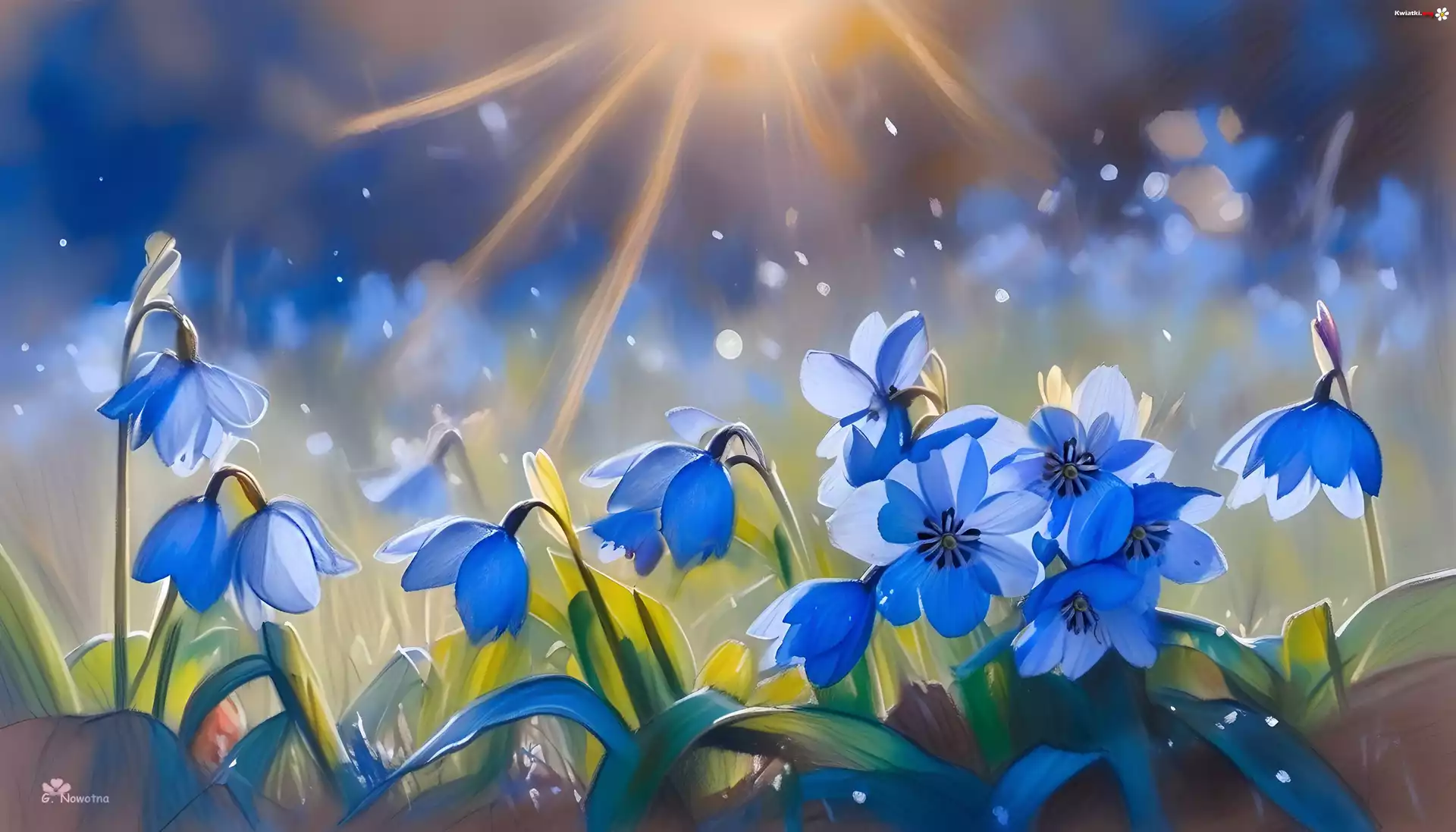 Grafika, Niebieskie, Kwiaty, Promienie słońca - Zdjęcia