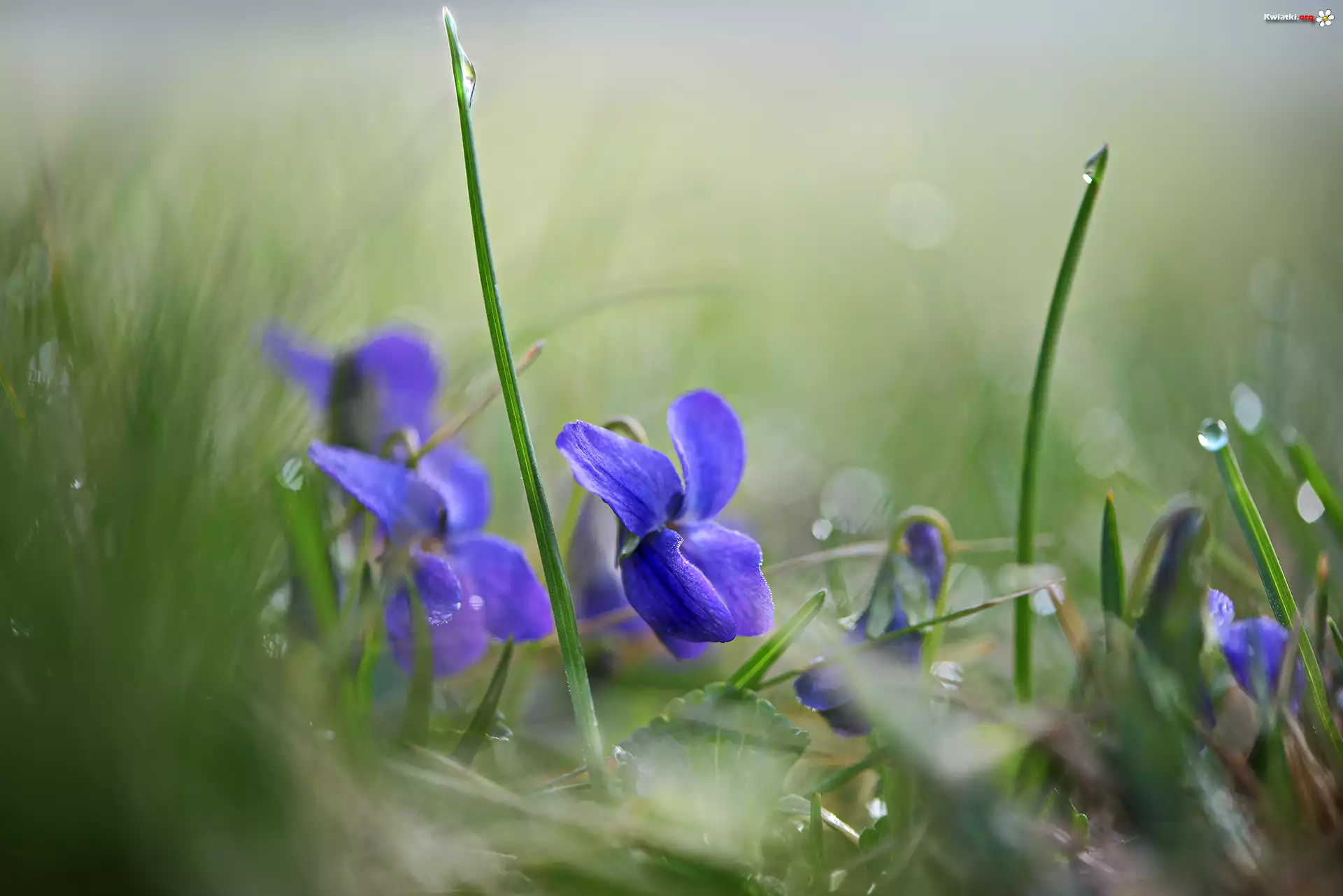 Kwiat Niebieskie, Kwiaty, Fiołki wonne, Trawa, Krople