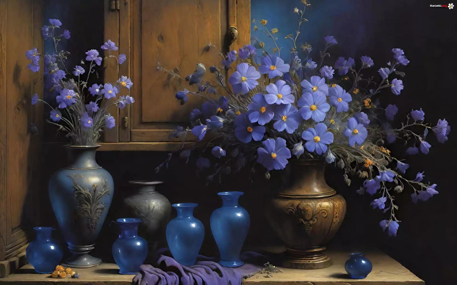 Kwiaty, Niebieskie, Wazony, Szafka, Kompozycja - Zdjęcia