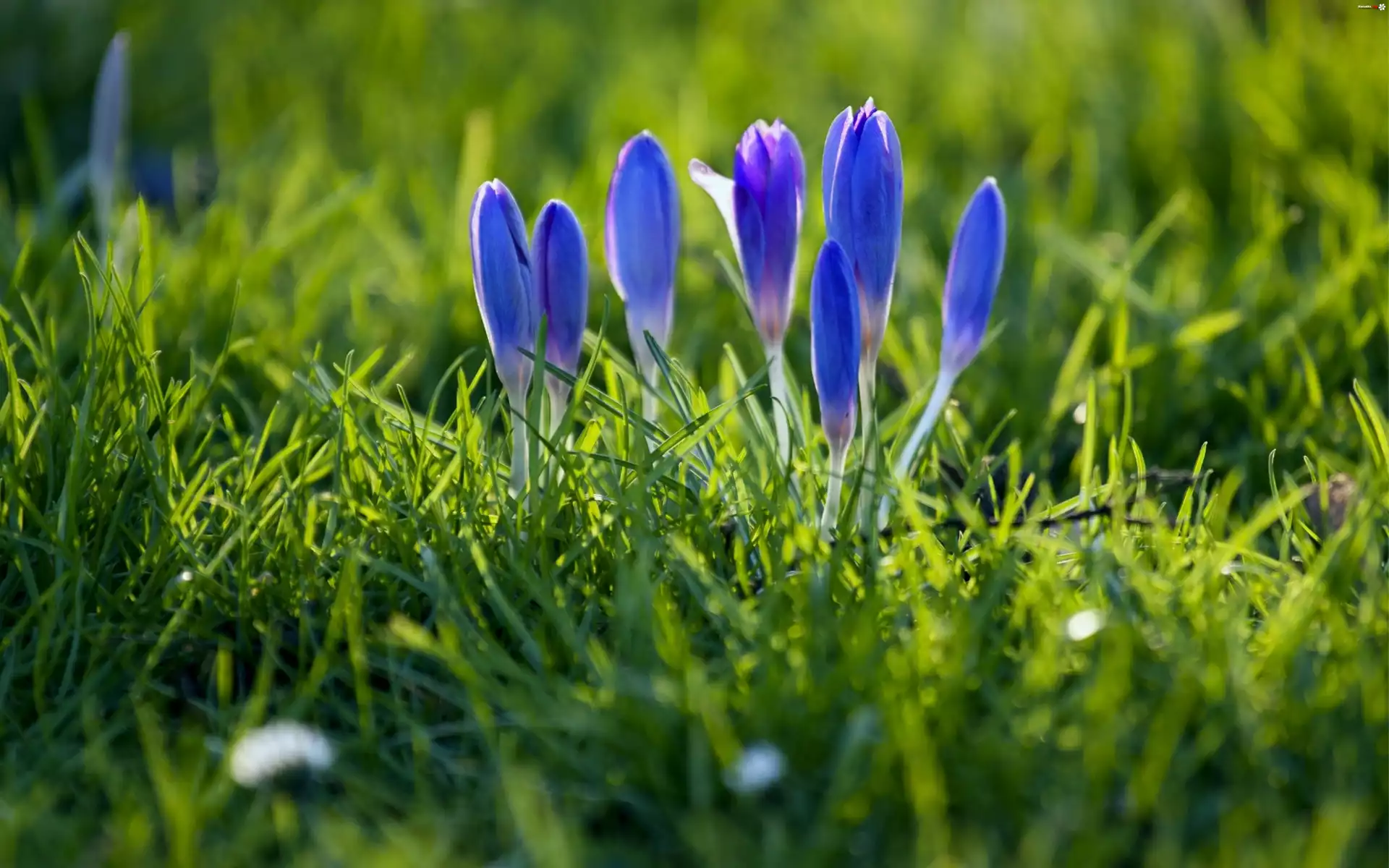 Kwiat Niebieskie, Krokusy, Wiosna, Trawa