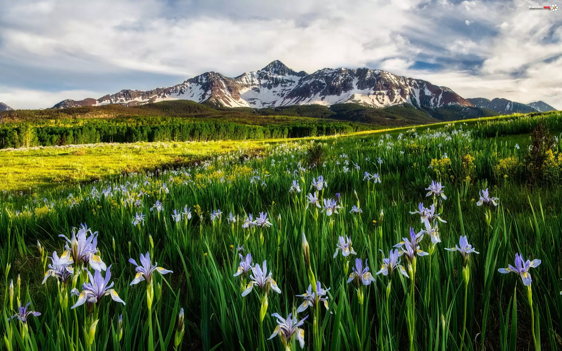 Stany Zjednoczone, Kolorado, San Juan Mountains, Wilson Peak, Góry, Irysy, Łąka, Niebo, Chmury, Kwiaty - Zdjęcia |