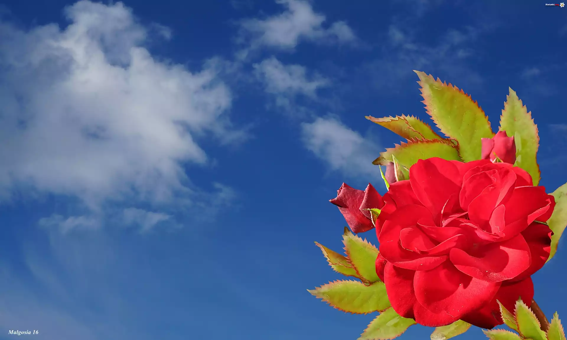 Niebo, Czerwona, Róża, Pąki, Liście - Zdjęcia