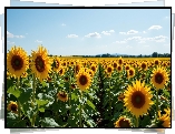 Kwiat Słoneczniki, Pole, Drzewa, Niebo